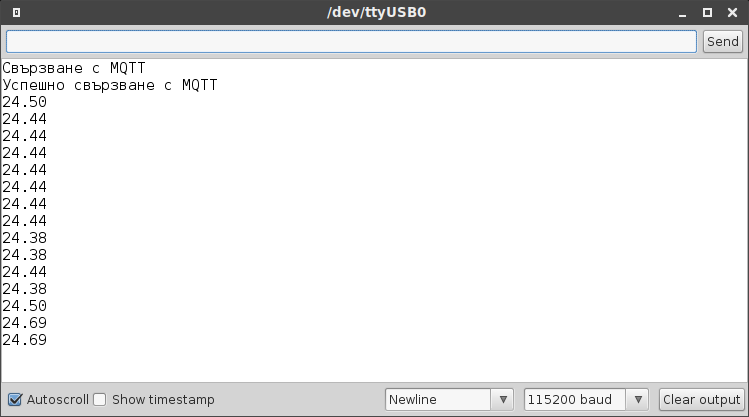 Как работи кода в loop – проверяваме дали има връзка с WiFi и MQTT. При успех прочитаме температурата от DS18B20 и извеждаме на серийния монитор. Ако температурата се различава с повече от 0.1 градуса от предишната комуникация с MQTT или са изтекли повече от 600 секунди (10 минути) тогава изпращаме данните с температурата през MQTT с опция задържане (retain).