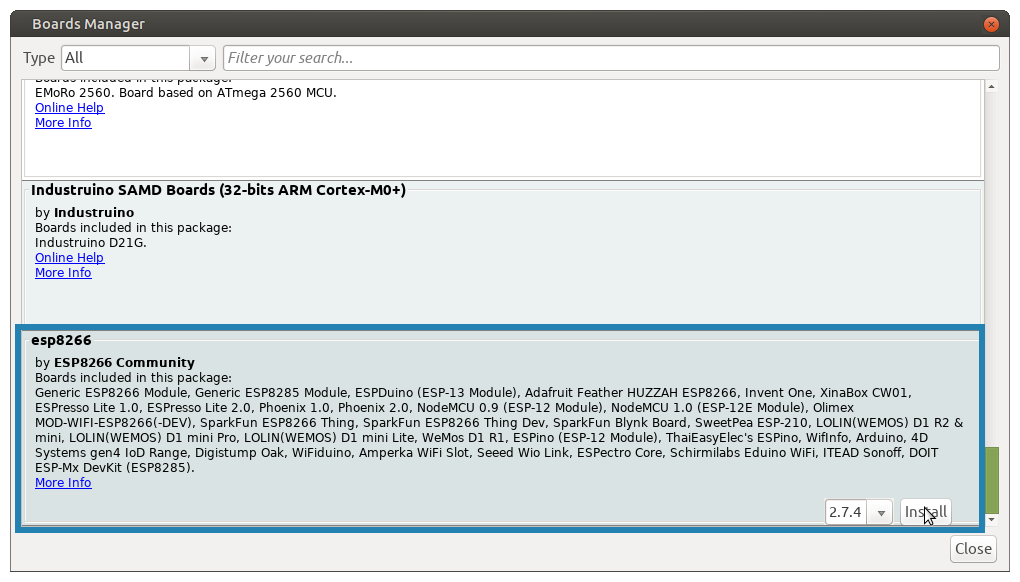 – Отворете Tools > Board: "…" > Boards Manager и инсталирайте esp8266 платформата.