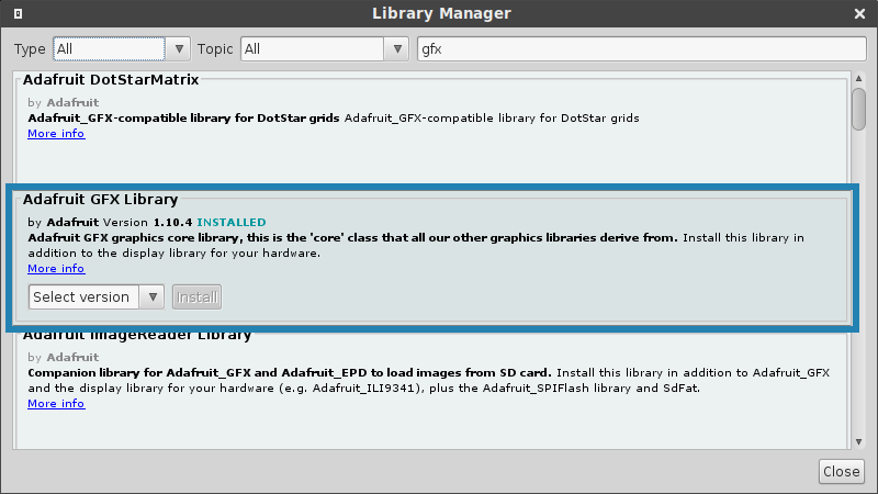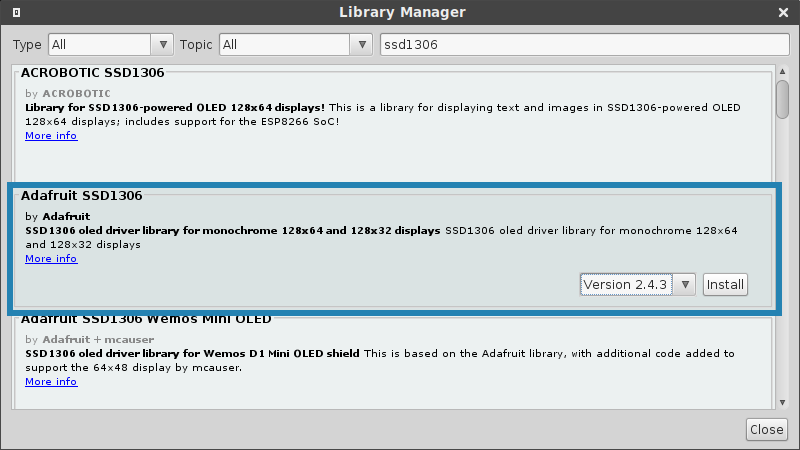 За да можем да работим с този екран ще се наложи да инсталираме две библиотеки – Adafruit_SSD1306 и Adafruit_GFX.