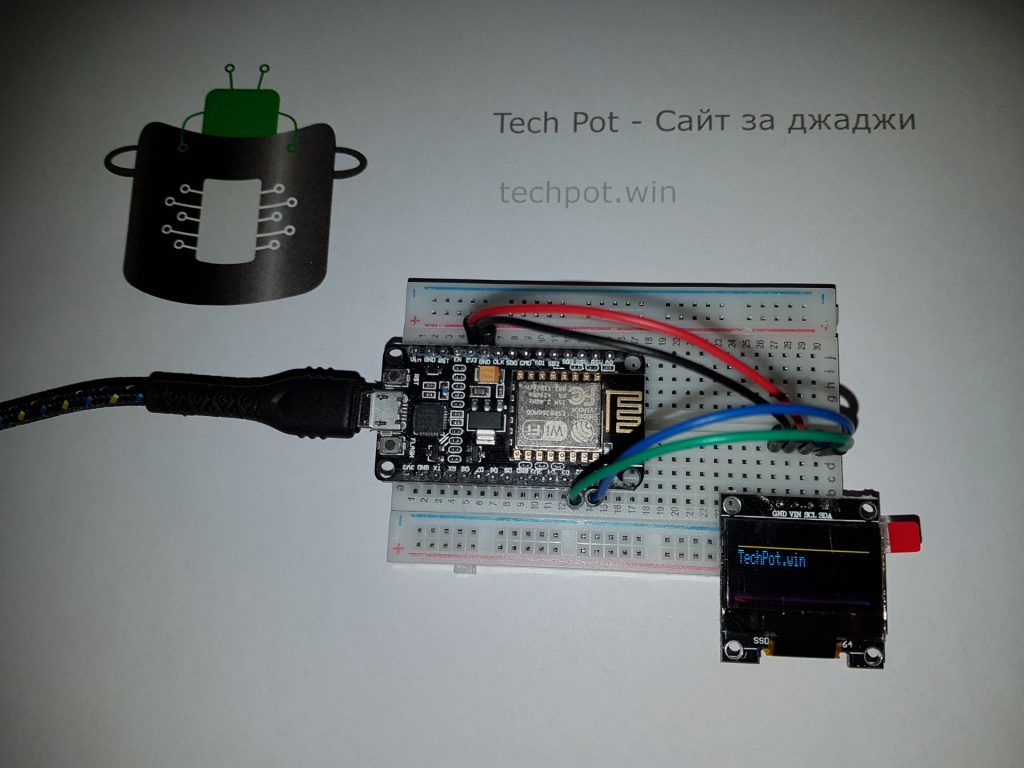 GNDна екрана къмGNDнаNodeMCU.VINна екрана към3V3наNodeMCU.SCLна екрана къмSCL (D1)наNodeMCU.SDAна екрана къмSDA (D2)наNodeMCU.